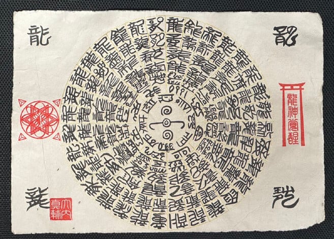 表面には100 体の龍との繋がりを表した超強力な霊力を持つフトマニ図が書かれ、周囲に書かれている「龍」の文字はどれ1つとして同じフォントはなく、書き順は筆者の先生に降ろされたインスピレーションにより記されます。