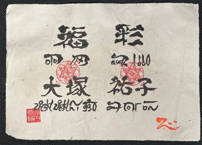上記写真の裏面の1段目はご自身が付けた龍神の名前(福彩)、2段目は福彩を龍体文字で表現、3段目はご自身の名前、4段目はご自身の名前を龍体文字で表現となります。
